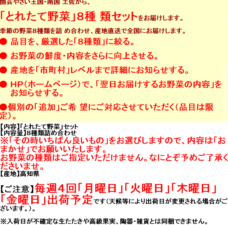 ★送料無料 「とれたて野菜」 8種類セット詰め合わせ 高知産 レシピ・追加機能付き ★ [Qv10]