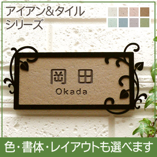 表札 おしゃれ タイル 戸建 アイアン & タイル表札 かわいいリーフ 長方形 取り付けキット付き タイル全8色 二世帯 / 書体 / レイアウト / 文字色 変更可
