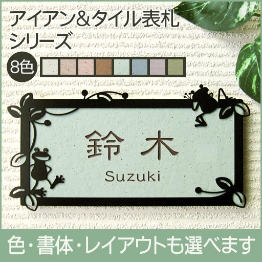 表札 おしゃれ タイル 戸建 アイアン & タイル表札 ブジカエル 長方形 取り付けキット付き タイル全8色 二世帯 / 書体 / レイアウト / 文字色 変更可
