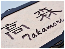 制作例(1)「高森 Takamori」様の仕様 タイル色:チェリーピンク レイアウト:A-4 文字色:色番号[19]コーヒーブラウン、1色入れ 書体:和文番号[7]古隷書体、英文番号[6]ブラッシュS アイアンもきれいにカットされています。