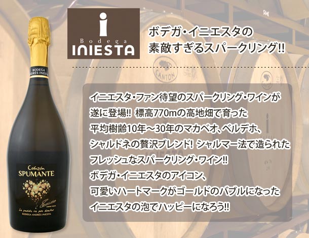 【祝 イニエスタ選手 ヴィッセル神戸入団!!】イニエスタの大ベストセラー・ワイン4本が揃った当店独自の特別限定セット!!何卒お早めにお買い求めください!! 全国一律送料無料!! こちらのセットとあわせて当店内の他のワインを追加で お買い物いただいても送料が無料となります!! 是非、この機会にご利用ください!! セット内容 : 赤750ml x 2本、白750ml x 1本、白スパークリング×1本 1本目 ボデガ・イニエスタ・フィンカ・エル・カリール・ティント 2015 Bodega Iniesta Finca El Carril Tinto 2015,Bodega Iniesta, D.O.Manchuela, Castilla y La Mancha, Spain 色・容量 赤750ml アルコール 14.0% ブドウ品種 テンプラニーリョ50%、シラー30%、プティ・ヴェルド20% 産地 スペイン−カスティーリャ・イ・ラ・マンチャ州−D.O.マンチュエラ 味わい ミディアム〜フルボディ ラベル表示 酸化防止剤(亜硫酸塩)、安定剤(アカシア) 2本目 ボデガ・イニエスタ・コラソン・スプマンテ Bodega Iniesta Corazon Spumante,Bodega Iniesta,Vino de Mesa, Castilla y La Mancha, Spain 色・容量 白スパークリングワイン750ml アルコール 11.5% ブドウ品種 マカベオ50%、ベルデホ50% 産地 スペイン−カスティーリャ・イ・ラ・マンチャ州−ビノ・デ・メサ(テーブルワイン) 味わい 辛口 ラベル表示 酸化防止剤(亜硫酸塩)、炭酸ガス含有 3本目 ボデガ・イニエスタ・コラソン・ロコ・ティント Bodega Iniesta Corazon Loco Tinto, D.O.Manchuela,Castilla y La Mancha, Spain 色・容量 赤750ml アルコール 13.5% ブドウ品種 テンプラニーリョ50%、シラー50% 産地 スペイン−カスティーリャ・イ・ラ・マンチャ州−D.O.マンチュエラ 味わい ミディアムボディ ラベル表示 酸化防止剤(亜硫酸塩)、安定剤(アカシア) 4本目 ボデガ・イニエスタ・コラソン・ロコ・ブランコ Bodega Iniesta Corazon Loco Blanco,Bodega Iniesta, D.O.Manchuela,Castilla y La Mancha,Spain 色・容量 白750ml アルコール 12.5% ブドウ品種 ソーヴィニヨン・ブラン55%、ベルデホ45% 産地 スペイン−カスティーリャ・イ・ラ・マンチャ州−D.O.マンチュエラ 味わい 辛口 ラベル表示 酸化防止剤(亜硫酸塩、ビタミンC)、安定剤(アカシア)、酸味料≪イニエスタ選手 ヴィッセル神戸入団記念!!≫ あの超スター・プレイヤー、イニエスタの 大ベストセラー・ワイン4本が揃った特別限定セット!! あの世界屈指のトップ・プレイヤー、イニエスタ選手のワイン4本を飲み比べ!! 当店独占直輸入の上級赤ワインとスパークリングも入ってます!! 他では入手できないレアな4本セット!! 全サッカー選手の最高栄誉バロン・ドール候補にも選ばれた ドン・アンドレスの熱き魂がここに!! 【Jリーグ移籍記念の特別限定セット!!】 皆でサッカー観戦、スポーツ観戦しながら盛り上がろう!! 【送料無料】≪イニエスタ選手 ヴィッセル神戸入団記念!≫ 当店独占直輸入の上級赤ワインとスパークも入った! ボデガ・イニエスタ ホームパーティ4本セット! [ボデガ・イニエスタ・フィンカ・エル・カリール・ティント 2015]Bodega Iniesta Finca El Carril Tinto 2015,Bodega Iniesta, D.O.Manchuela, Castilla y La Mancha, Spain 色・容量:赤750ml アルコール度数:14.0% 葡萄品種:テンプラニーリョ50%、シラー30%、プティヴェルド20% 産地 :スペイン−カスティーリャ・イ・ラ・マンチャ州−D.O.マンチュエラ 味わい :ミディアム〜フルボディ ラベル表示:酸化防止剤(亜硫酸塩)、安定剤(アカシア) [ボデガ・イニエスタ・コラソン・スプマンテ]Bodega Iniesta Corazon Spumante,Bodega Iniesta,Vino de Mesa, Castilla y La Mancha, Spain 色・容量:白スパークリングワイン750ml アルコール度数:11.5% 葡萄品種:マカベオ50%、ベルデホ50% 産地 :スペイン−カスティーリャ・イ・ラ・マンチャ州−ビノ・デ・メサ(テーブルワイン) 味わい :辛口 ラベル表示:酸化防止剤(亜硫酸塩)、炭酸ガス含有 [ボデガ・イニエスタ・コラソン・ロコ・ティント]Bodega Iniesta Corazon Loco Tinto, D.O.Manchuela,Castilla y La Mancha, Spain 色・容量:赤750ml アルコール度数:13.5% 葡萄品種:テンプラニーリョ50%、シラー50% 産地 :スペイン−カスティーリャ・イ・ラ・マンチャ州−D.O.マンチュエラ 味わい :ミディアムボディ ラベル表示:酸化防止剤(亜硫酸塩)、安定剤(アカシア) [ボデガ・イニエスタ・コラソン・ロコ・ブランコ]Bodega Iniesta Corazon Loco Blanco,Bodega Iniesta, D.O.Manchuela,Castilla y La Mancha,Spain 色・容量:白750ml アルコール度数:12.5% 葡萄品種:ソーヴィニヨンブラン55%、ベルデホ45% 産地 :スペイン−カスティーリャ・イ・ラ・マンチャ州−D.O.マンチュエラ 味わい :辛口 ラベル表示:酸化防止剤(亜硫酸塩、ビタミンC)、安定剤(アカシア)、酸味料