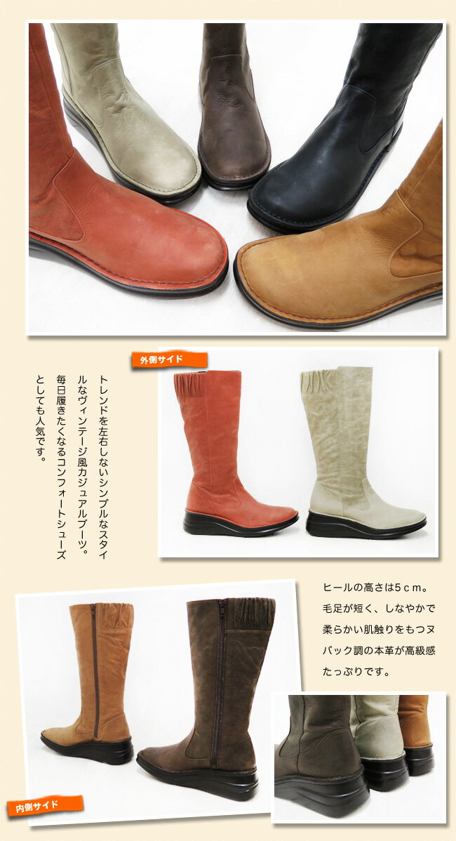 ■カラー: ブラック・グレージュ・ダークブラウン・ライトブラウン・ピンク ■サイズ: ■ヒール高さ:5cm ■筒高さ:31cm ■筒周り:35〜42cm(※ギャザー分含む) ■ワイズ:3E ■足入れ:ゆったり サイズ 22.5 23.0 23.5 24.0 24.5 筒幅内径 35 35.5 36 36.5 37 ほどよくゆったり設計♪