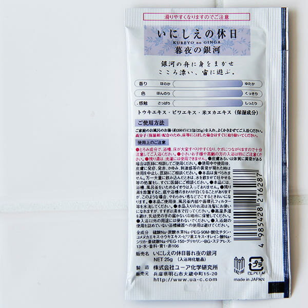 ご使用方法 ご家庭のお風呂のお湯(約200ml)に1包(25g)を入れ、よくかきまぜてご入浴ください。